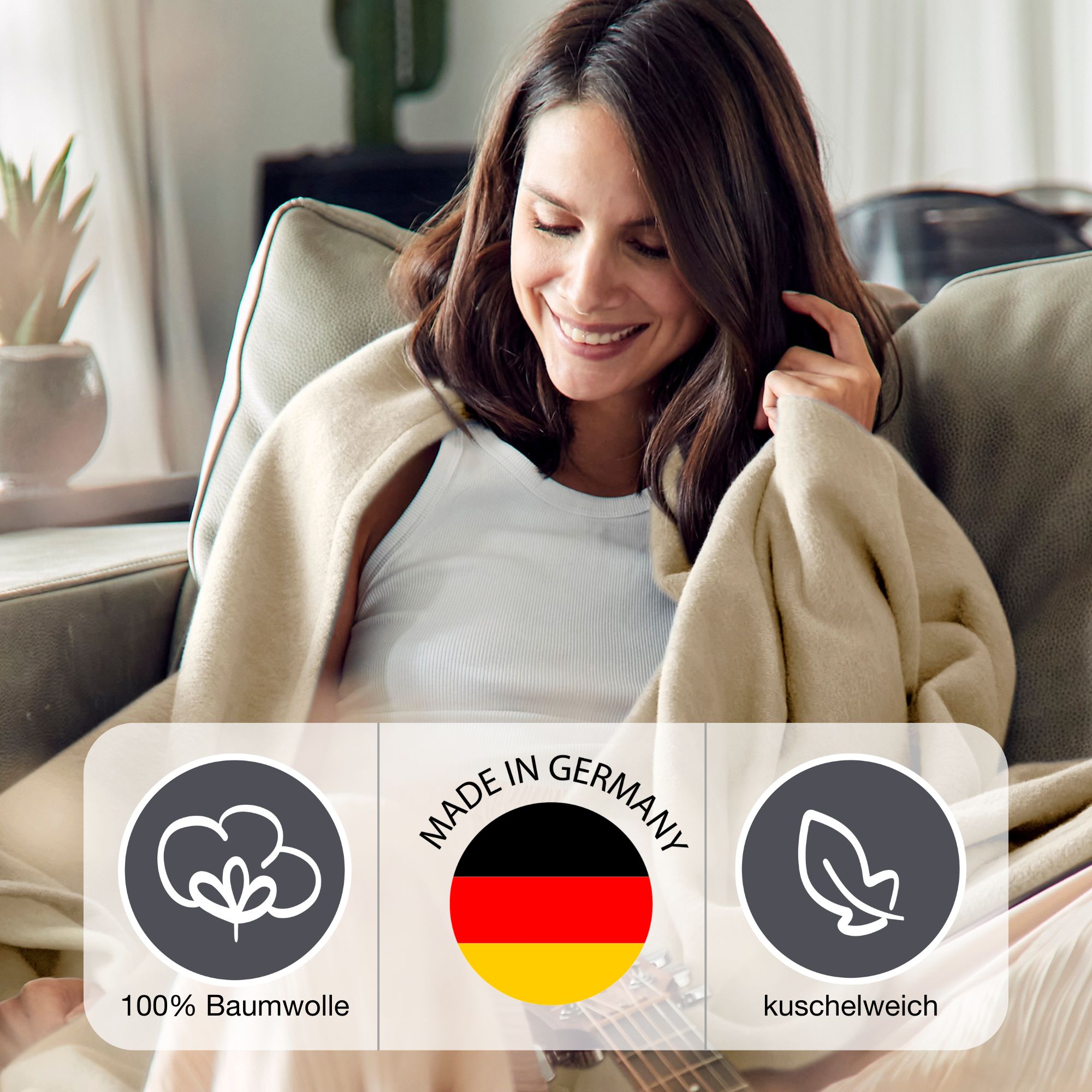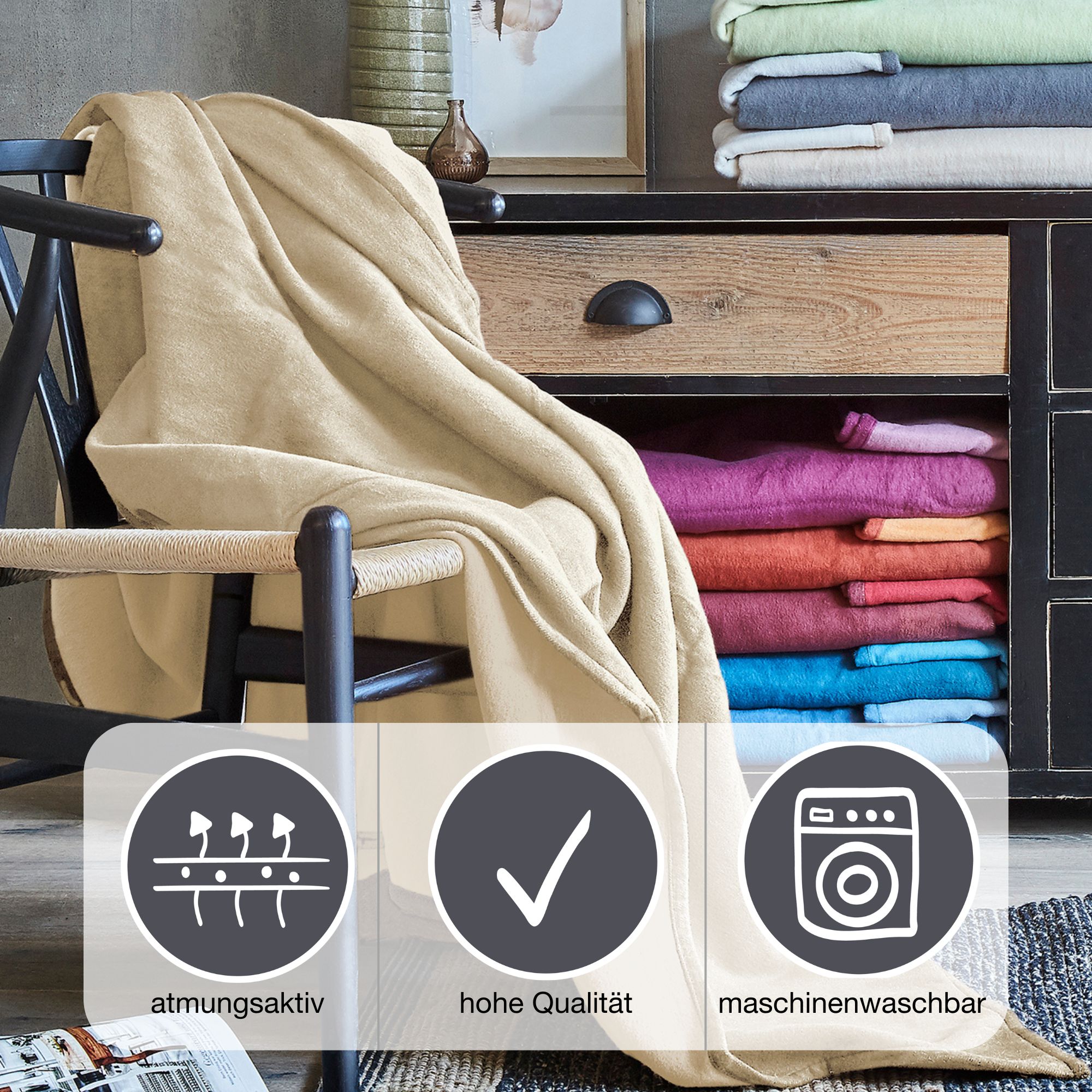 Durch die Naturfaser ist die Wohndecke weich & atmungsaktiv, zudem angenehm leicht.