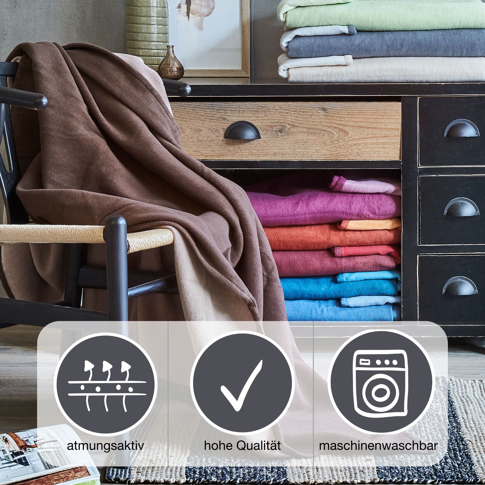 Durch die Naturfaser ist die Wohndecke weich & atmungsaktiv, zudem angenehm leicht.