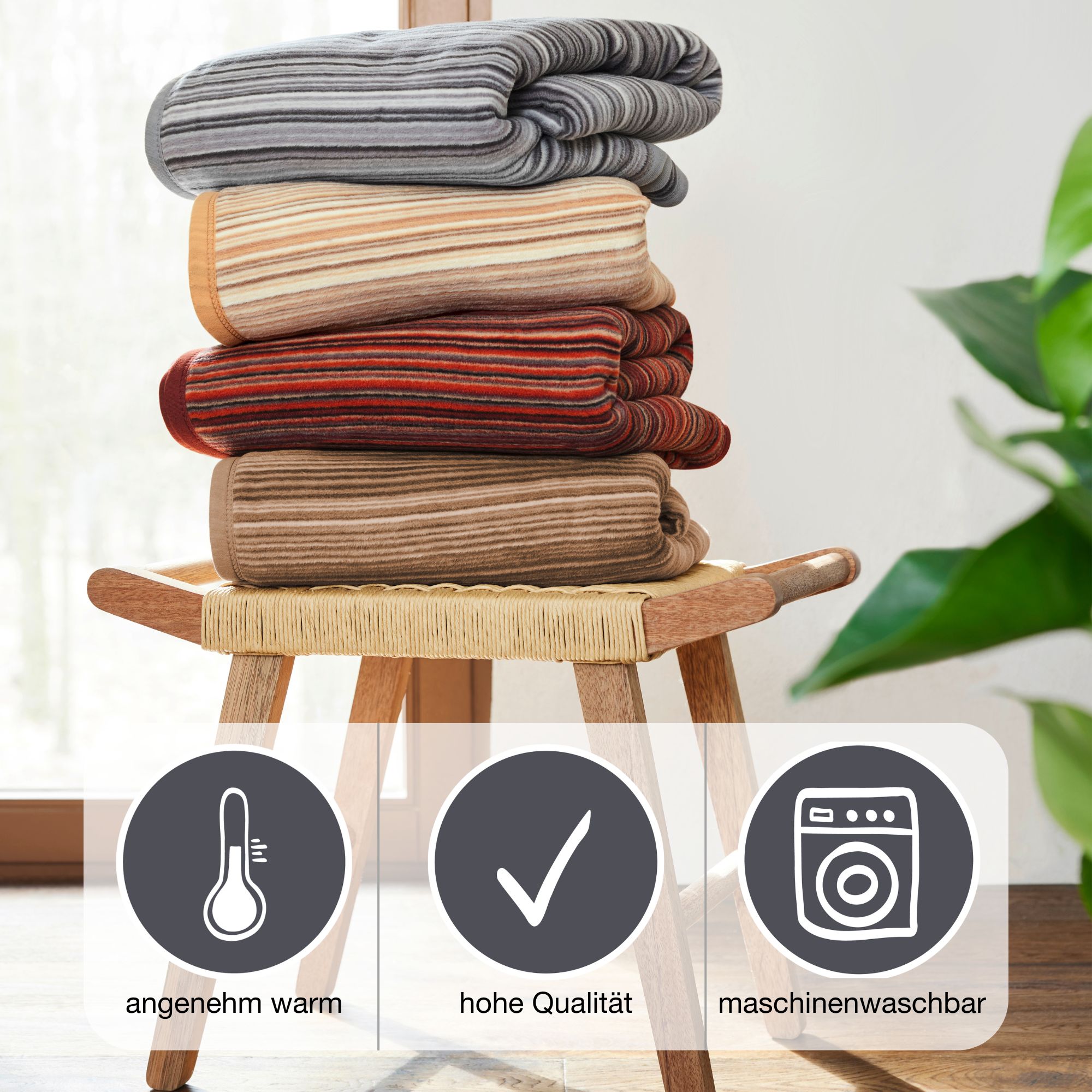 Die Wohndecke ist schön weich auf der Haut und wärmend. Sie eignet sich perfekt für das ganze Jahr, egal ob Sommer oder Winter, die Decke lädt jederzeit zum Kuscheln ein.