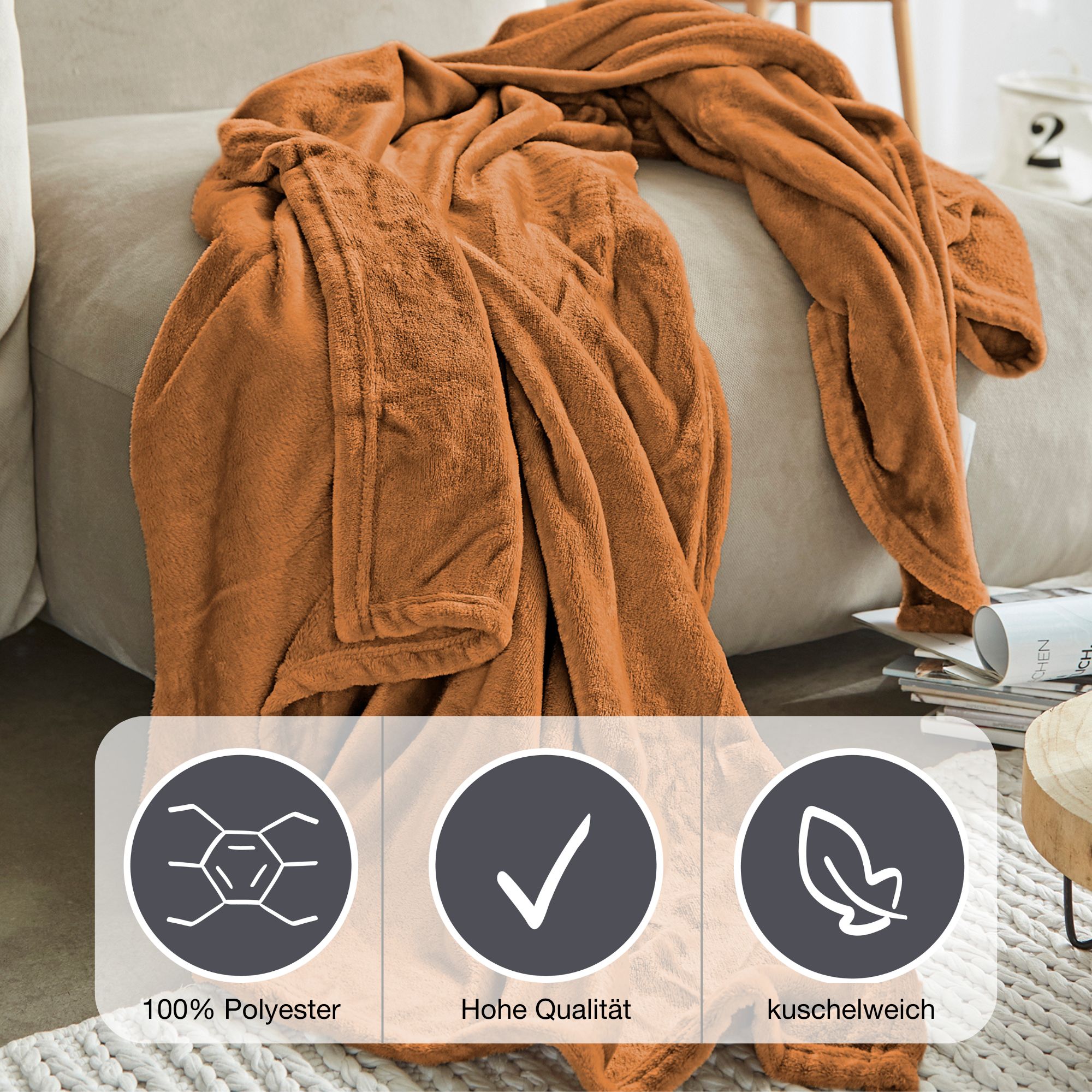 The IBENA fleece blanket Olbia is an absolute must-have for anyone looking for a high-quality and cozy blanket. It is very soft and fluffy, giving a feeling of coziness and warmth. Made from high-quality materials, it is not only visually appealing, but also durable and hard-wearing. It is particularly noteworthy that the blanket is Oeko-Tex Standard 100 certified. This means that it is free from harmful chemicals and therefore harmless to health. So you can snuggle up in the blanket and relax without any worries.