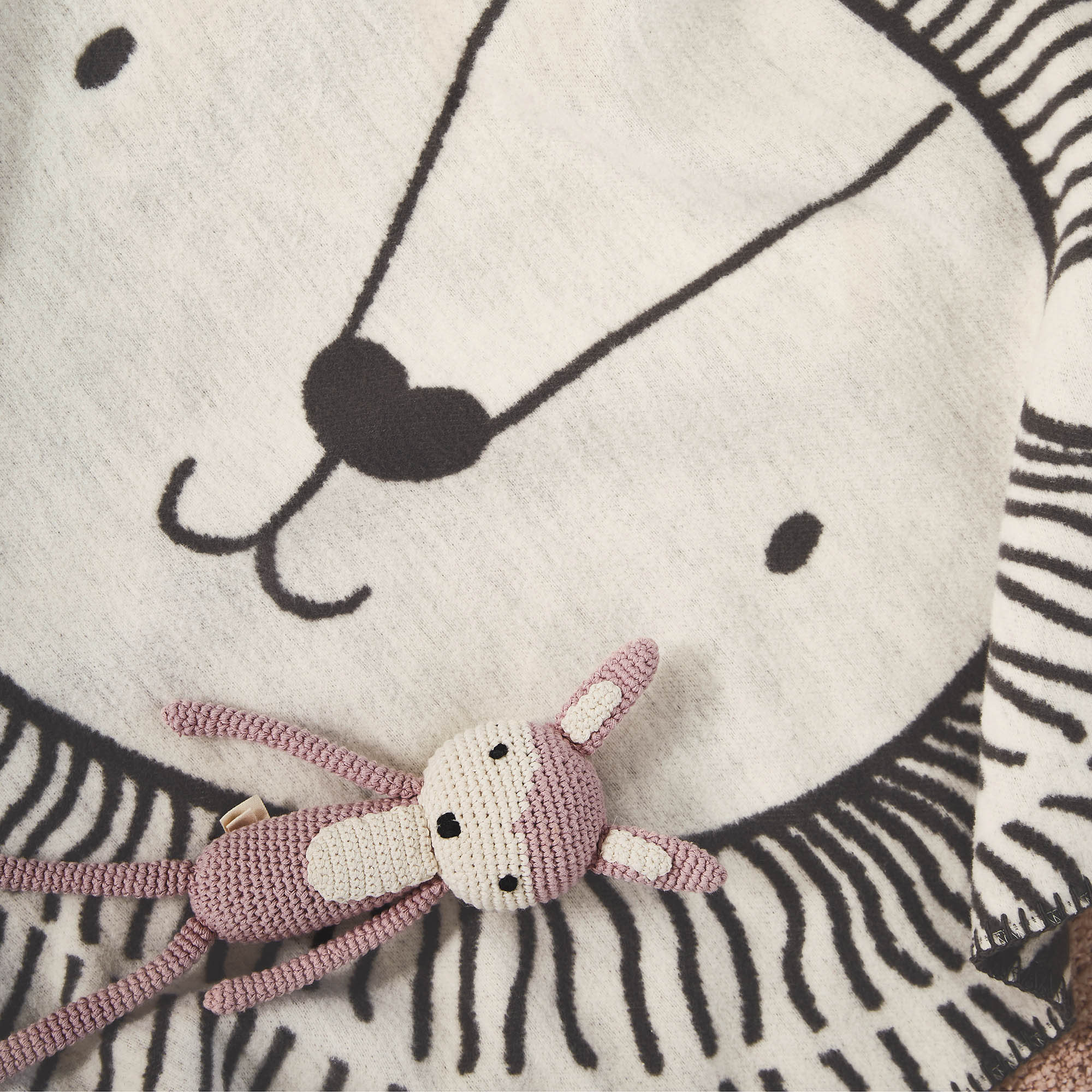 The cosy blanket is made of 58% cotton, 35% polyacrylic, 7% polyester.